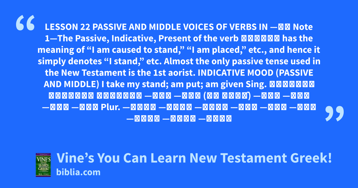 LESSON 22 PASSIVE AND MIDDLE VOICES OF VERBS IN —μι Note 1—The Passive, Indicative, Present of the verb ἵστημι has the meaning of “I am caused to stand,” “I am placed,” etc., and hence it simply denotes “I stand,” etc. Almost the only passive tense used in the New Testament is the 1st aorist. INDICATIVE MOOD (PASSIVE AND MIDDLE) I take my stand; am put; am given Sing. ἵσταμαι τίθεμαι δίδομαι —σαι —σαι (ορ τιθῃ̂) —σαι —ται —ται —ται Plur. —μεθα —μεθα —μεθα —σθε —σθε —σθε —νται —νται —νται