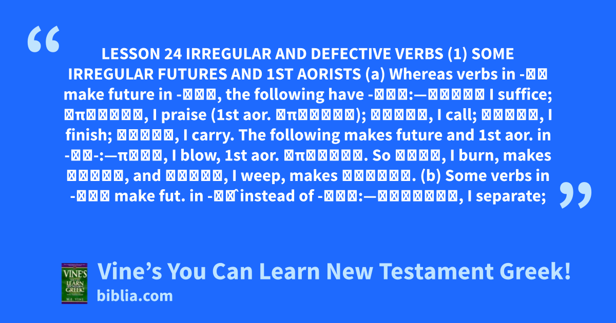 LESSON 24 IRREGULAR AND DEFECTIVE VERBS (1) SOME IRREGULAR FUTURES AND 1ST AORISTS (a) Whereas verbs in -εω make future in -ήσω, the following have -έσω:—ἀρκέω I suffice; ἐπαινέω, I praise (1st aor. ἐπῄνεσα); καλέω, I call; τελέω, I finish; φορέω, I carry. The following makes future and 1st aor. in -ευ-:—πνέω, I blow, 1st aor. ἔπνευσα. So καίω, I burn, makes καύσω, and κλαίω, I weep, makes κλαύσω. (b) Some verbs in -ίζω make fut. in -ιω̂ instead of -ίσω:—ἀφορίζω, I separate;