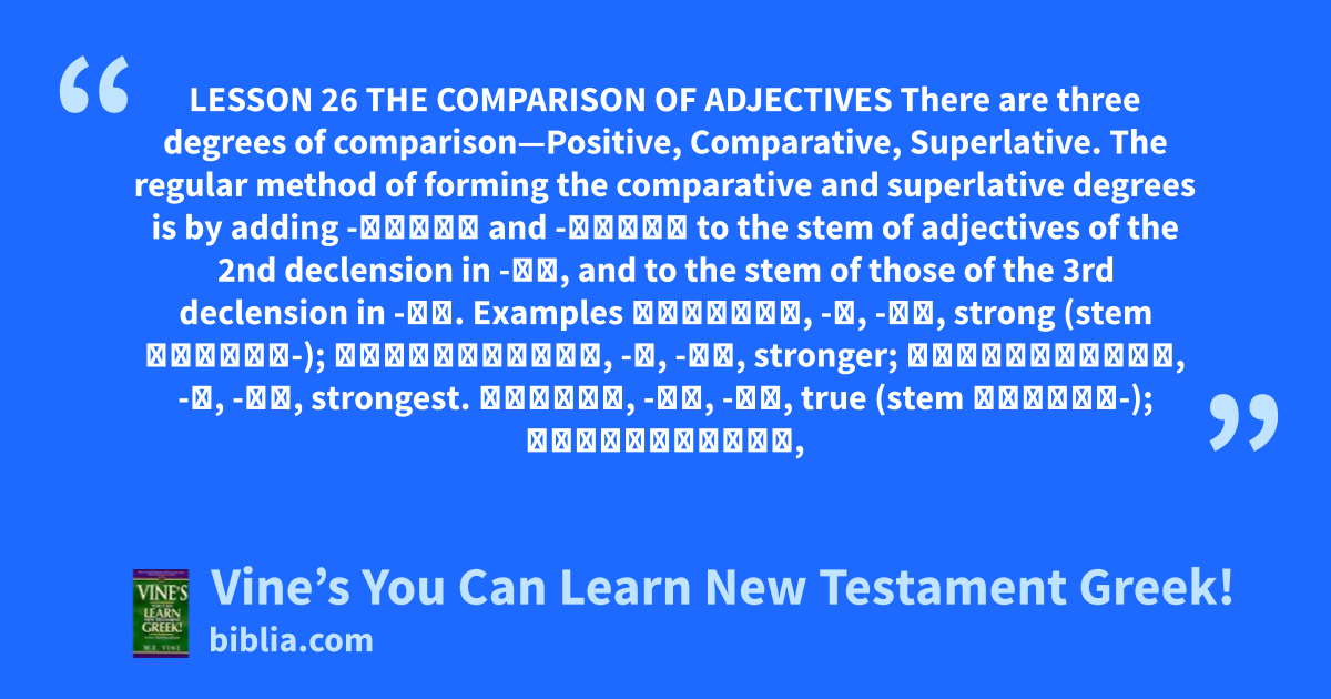 LESSON 26 THE COMPARISON OF ADJECTIVES There are three degrees of comparison—Positive, Comparative, Superlative. The regular method of forming the comparative and superlative degrees is by adding -τερος and -τατος to the stem of adjectives of the 2nd declension in -ος, and to the stem of those of the 3rd declension in -ης. Examples ἰσχυρός, -ά, -όν, strong (stem ἰσχυρο-); ἰσχυρότερος, -α, -ον, stronger; ἰσχυρότατος, -η, -ον, strongest. ἀληθής, -ής, -ές, true (stem ἀληθεσ-); ἀληθέστερος,