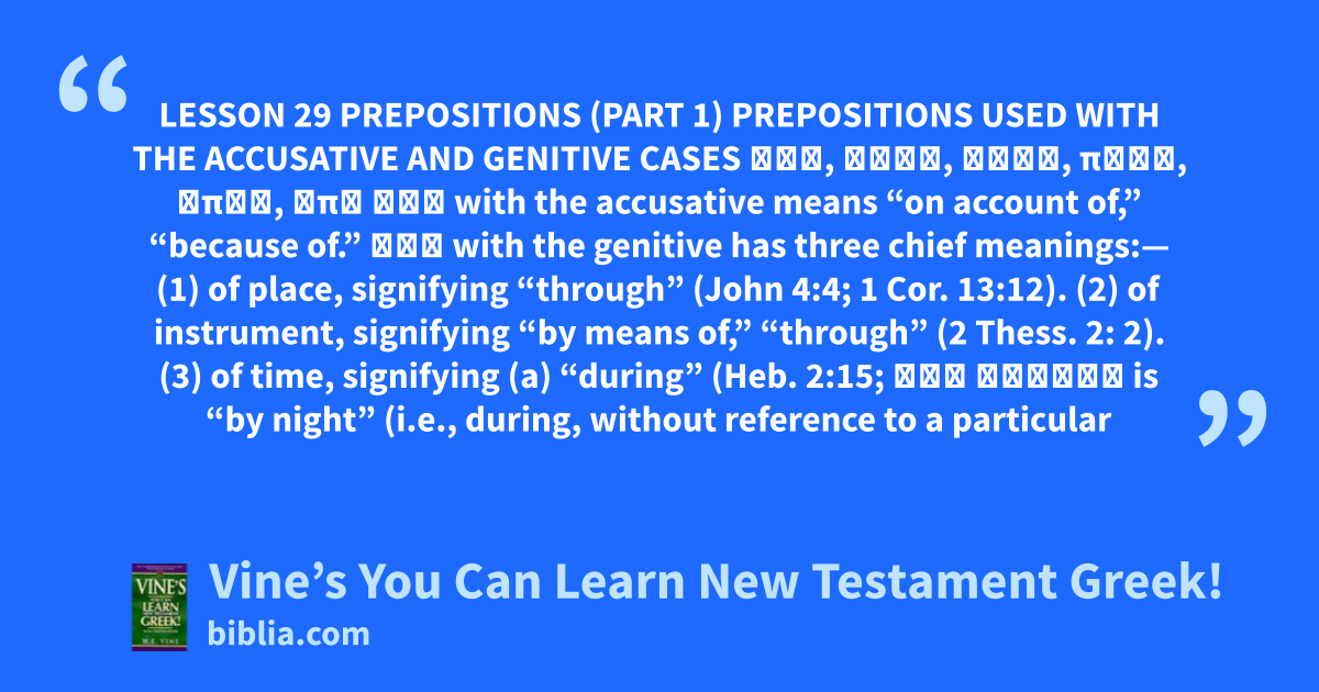 LESSON 29 PREPOSITIONS (PART 1) PREPOSITIONS USED WITH THE ACCUSATIVE AND GENITIVE CASES διά, κατά, μετά, περί, ὑπέρ, ὑπό διά with the accusative means “on account of,” “because of.” διά with the genitive has three chief meanings:— (1) of place, signifying “through” (John 4:4; 1 Cor. 13:12). (2) of instrument, signifying “by means of,” “through” (2 Thess. 2: 2). (3) of time, signifying (a) “during” (Heb. 2:15; διὰ νυκτός is “by night” (i.e., during, without reference to a particular