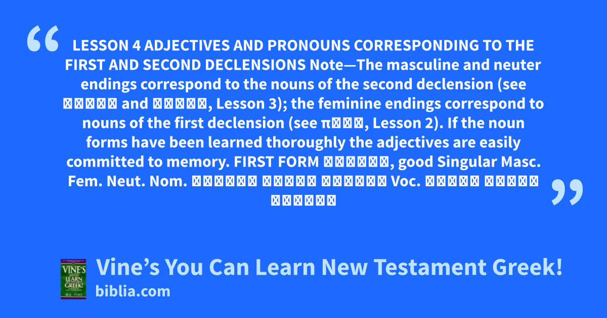 LESSON 4 ADJECTIVES AND PRONOUNS CORRESPONDING TO THE FIRST AND SECOND DECLENSIONS Note—The masculine and neuter endings correspond to the nouns of the second declension (see λόγος and ἔργον, Lesson 3); the feminine endings correspond to nouns of the first declension (see πύλη, Lesson 2). If the noun forms have been learned thoroughly the adjectives are easily committed to memory. FIRST FORM ἀγαθός, good Singular Masc. Fem. Neut. Nom. ἀγαθός ἀγαθή ἀγαθόν Voc. ἀγαθέ ἀγαθή ἀγαθόν