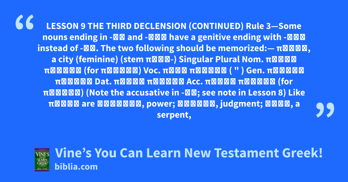 LESSON 9 THE THIRD DECLENSION (CONTINUED) Rule 3—Some nouns ending in -ις and -ευς have a genitive ending with -εως instead of -ος. The two following should be memorized:— πόλις, a city (feminine) (stem πολι-) Singular Plural Nom. πόλις πόλεις (for πόλεες) Voc. πόλι πόλεις ( " ) Gen. πόλεως πόλεων Dat. πόλει πόλεσι Acc. πόλιν πόλεις (for πόλεας) (Note the accusative in -ιν; see note in Lesson 8) Like πόλις are δύναμις, power; κρίσις, judgment; ὄφις, a serpent,