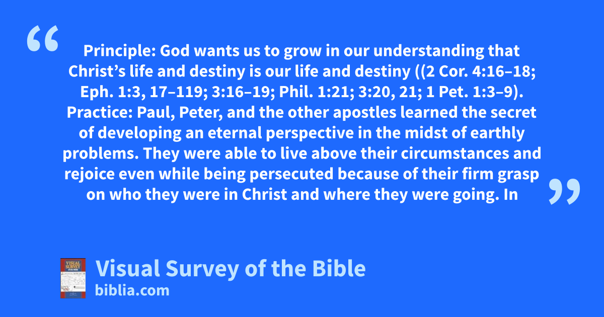 Principle: God wants us to grow in our understanding that Christ’s life and destiny is our life and destiny ((2 Cor. 4:16–18; Eph. 1:3, 17–119; 3:16–19; Phil. 1:21; 3:20, 21; 1 Pet. 1:3–9). Practice: Paul, Peter, and the other apostles learned the secret of developing an eternal perspective in the midst of earthly problems. They were able to live above their circumstances and rejoice even while being persecuted because of their firm grasp on who they were in Christ and where they were going. In