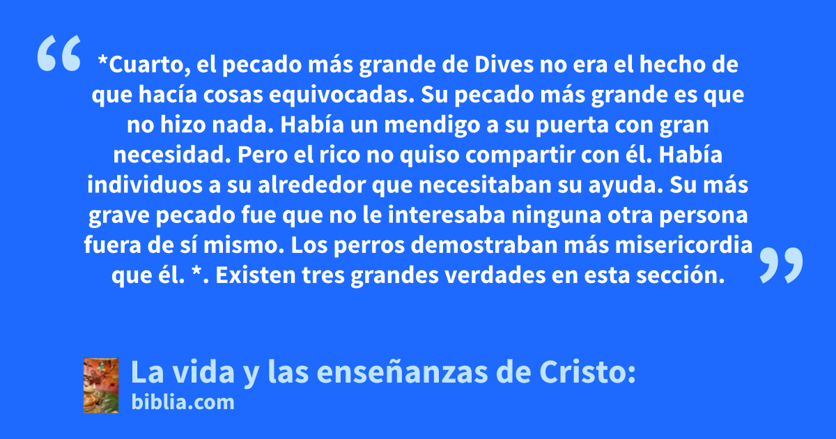 *Cuarto, el pecado más grande de Dives no era el hecho de que hacía cosas equivocadas. Su pecado más grande es que no hizo nada. Había un mendigo a su puerta con gran necesidad. Pero el rico no quiso compartir con él. Había individuos a su alrededor que necesitaban su ayuda. Su más grave pecado fue que no le interesaba ninguna otra persona fuera de sí mismo. Los perros demostraban más misericordia que él. *. Existen tres grandes verdades en esta sección.