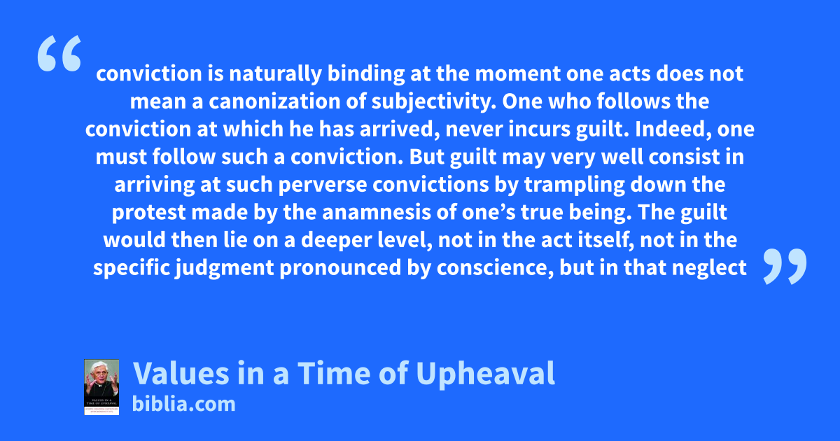 conviction is naturally binding at the moment one acts does not mean a canonization of subjectivity. One who follows the conviction at which he has arrived, never incurs guilt. Indeed, one must follow such a conviction. But guilt may very well consist in arriving at such perverse convictions by trampling down the protest made by the anamnesis of one’s true being. The guilt would then lie on a deeper level, not in the act itself, not in the specific judgment pronounced by conscience, but in that neglect