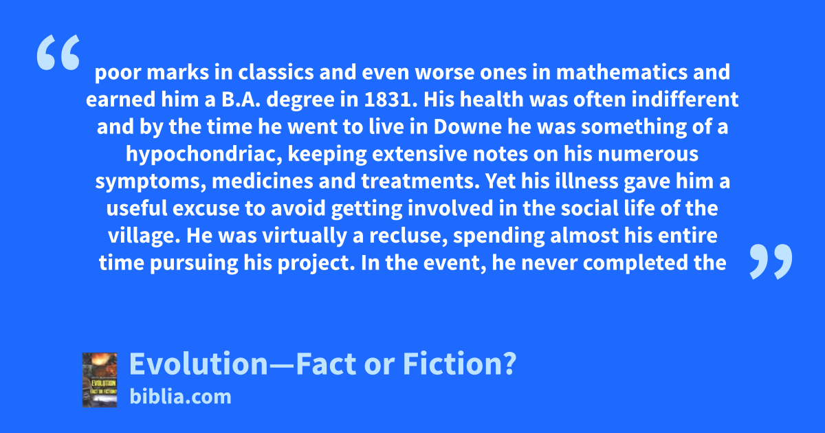 poor marks in classics and even worse ones in mathematics and earned him a B.A. degree in 1831. His health was often indifferent and by the time he went to live in Downe he was something of a hypochondriac, keeping extensive notes on his numerous symptoms, medicines and treatments. Yet his illness gave him a useful excuse to avoid getting involved in the social life of the village. He was virtually a recluse, spending almost his entire time pursuing his project. In the event, he never completed the