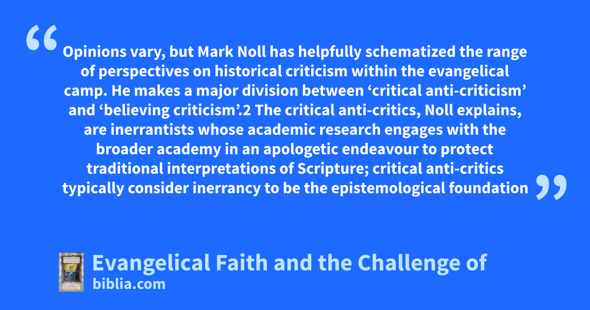 Opinions vary, but Mark Noll has helpfully schematized the range of perspectives on historical criticism within the evangelical camp. He makes a major division between ‘critical anti-criticism’ and ‘believing criticism’.2 The critical anti-critics, Noll explains, are inerrantists whose academic research engages with the broader academy in an apologetic endeavour to protect traditional interpretations of Scripture; critical anti-critics typically consider inerrancy to be the epistemological foundation