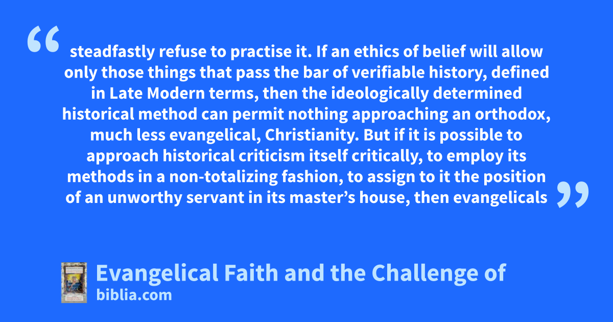 steadfastly refuse to practise it. If an ethics of belief will allow only those things that pass the bar of verifiable history, defined in Late Modern terms, then the ideologically determined historical method can permit nothing approaching an orthodox, much less evangelical, Christianity. But if it is possible to approach historical criticism itself critically, to employ its methods in a non-totalizing fashion, to assign to it the position of an unworthy servant in its master’s house, then evangelicals