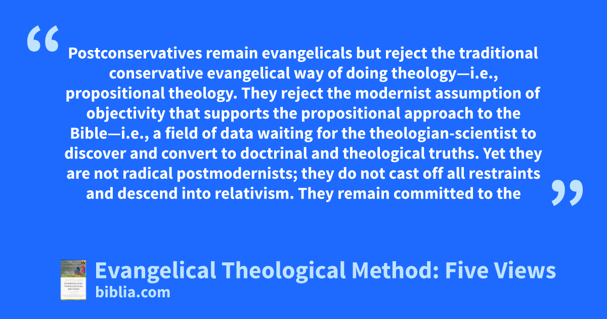 Postconservatives remain evangelicals but reject the traditional conservative evangelical way of doing theology—i.e., propositional theology. They reject the modernist assumption of objectivity that supports the propositional approach to the Bible—i.e., a field of data waiting for the theologian-scientist to discover and convert to doctrinal and theological truths. Yet they are not radical postmodernists; they do not cast off all restraints and descend into relativism. They remain committed to the