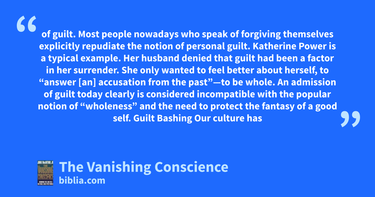 of guilt. Most people nowadays who speak of forgiving themselves explicitly repudiate the notion of personal guilt. Katherine Power is a typical example. Her husband denied that guilt had been a factor in her surrender. She only wanted to feel better about herself, to “answer [an] accusation from the past”—to be whole. An admission of guilt today clearly is considered incompatible with the popular notion of “wholeness” and the need to protect the fantasy of a good self. Guilt Bashing Our culture has