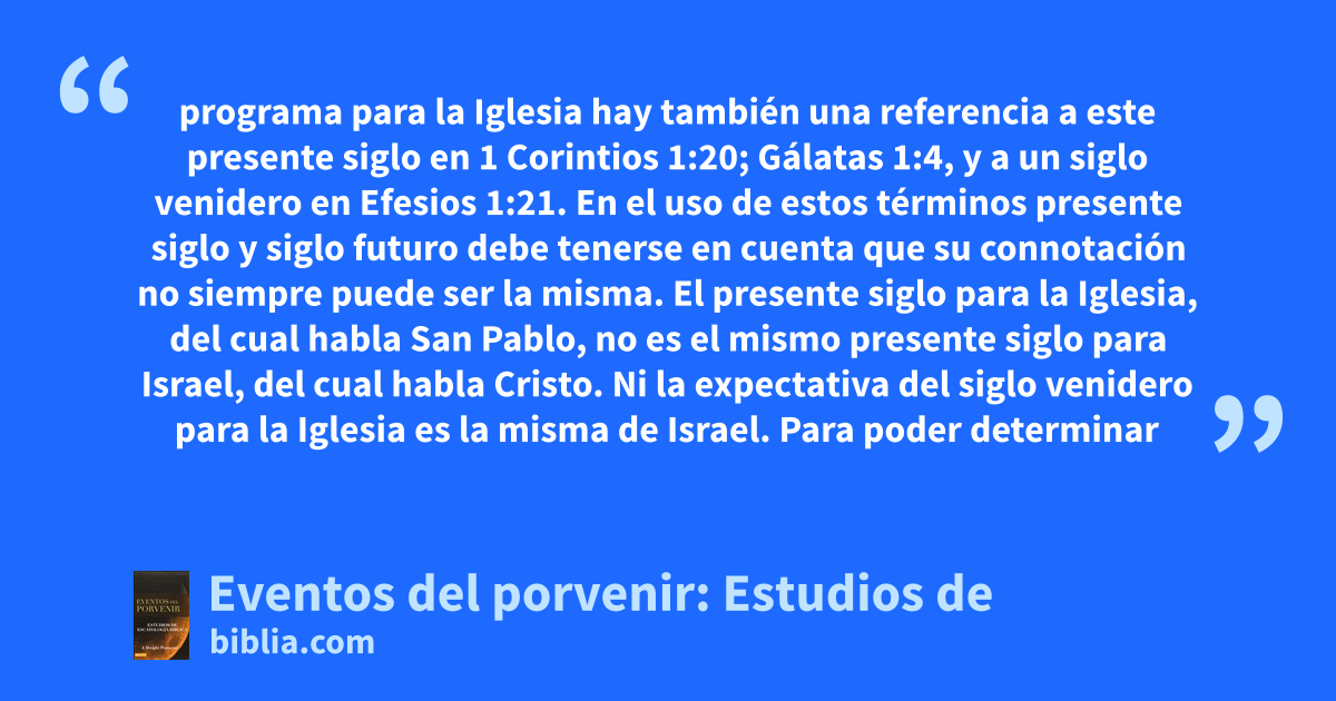 programa para la Iglesia hay también una referencia a este presente siglo en 1 Corintios 1:20; Gálatas 1:4, y a un siglo venidero en Efesios 1:21. En el uso de estos términos presente siglo y siglo futuro debe tenerse en cuenta que su connotación no siempre puede ser la misma. El presente siglo para la Iglesia, del cual habla San Pablo, no es el mismo presente siglo para Israel, del cual habla Cristo. Ni la expectativa del siglo venidero para la Iglesia es la misma de Israel. Para poder determinar