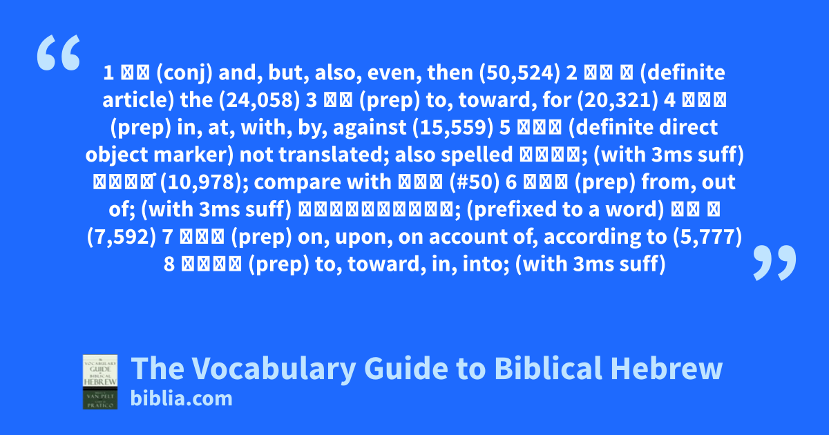 1 וְ (conj) and, but, also, even, then (50,524) 2 הַ ּ (definite article) the (24,058) 3 לְ (prep) to, toward, for (20,321) 4 בְּ (prep) in, at, with, by, against (15,559) 5 אֵת (definite direct object marker) not translated; also spelled אֶת־; (with 3ms suff) אֹתו̇ (10,978); compare with אֵת (#50) 6 מִן (prep) from, out of; (with 3ms suff) מִמֶּ֫נּוּ; (prefixed to a word) מִ ּ (7,592) 7 עַל (prep) on, upon, on account of, according to (5,777) 8 אֶל־ (prep) to, toward, in, into; (with 3ms suff)