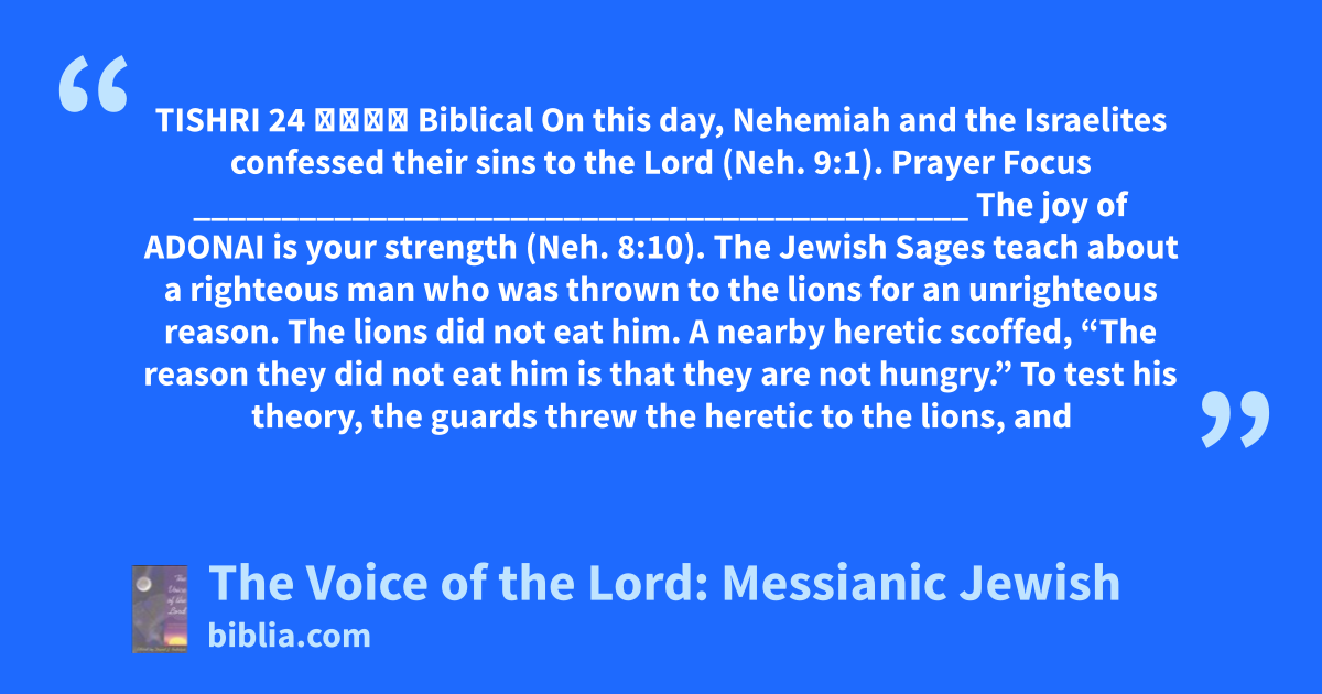 TISHRI 24 תשרי Biblical On this day, Nehemiah and the Israelites confessed their sins to the Lord (Neh. 9:1). Prayer Focus ____________________________________________ The joy of ADONAI is your strength (Neh. 8:10). The Jewish Sages teach about a righteous man who was thrown to the lions for an unrighteous reason. The lions did not eat him. A nearby heretic scoffed, “The reason they did not eat him is that they are not hungry.” To test his theory, the guards threw the heretic to the lions, and