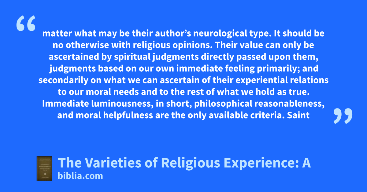 matter what may be their author’s neurological type. It should be no otherwise with religious opinions. Their value can only be ascertained by spiritual judgments directly passed upon them, judgments based on our own immediate feeling primarily; and secondarily on what we can ascertain of their experiential relations to our moral needs and to the rest of what we hold as true. Immediate luminousness, in short, philosophical reasonableness, and moral helpfulness are the only available criteria. Saint