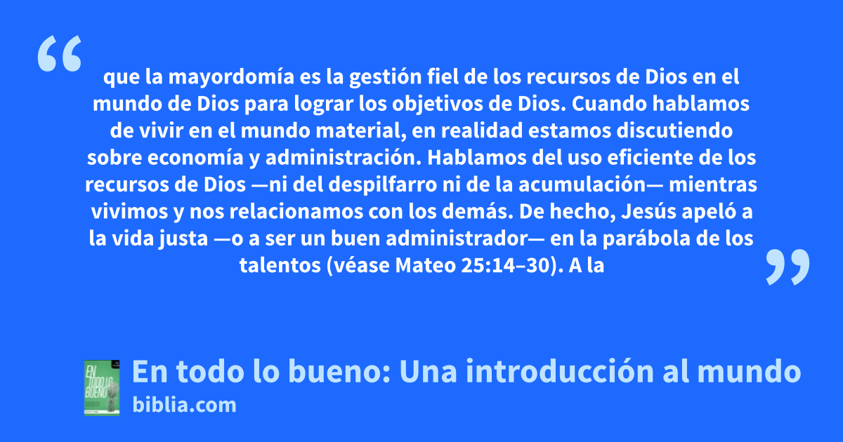 que la mayordomía es la gestión fiel de los recursos de Dios en el mundo de Dios para lograr los objetivos de Dios. Cuando hablamos de vivir en el mundo material, en realidad estamos discutiendo sobre economía y administración. Hablamos del uso eficiente de los recursos de Dios —ni del despilfarro ni de la acumulación— mientras vivimos y nos relacionamos con los demás. De hecho, Jesús apeló a la vida justa —o a ser un buen administrador— en la parábola de los talentos (véase Mateo 25:14–30). A la