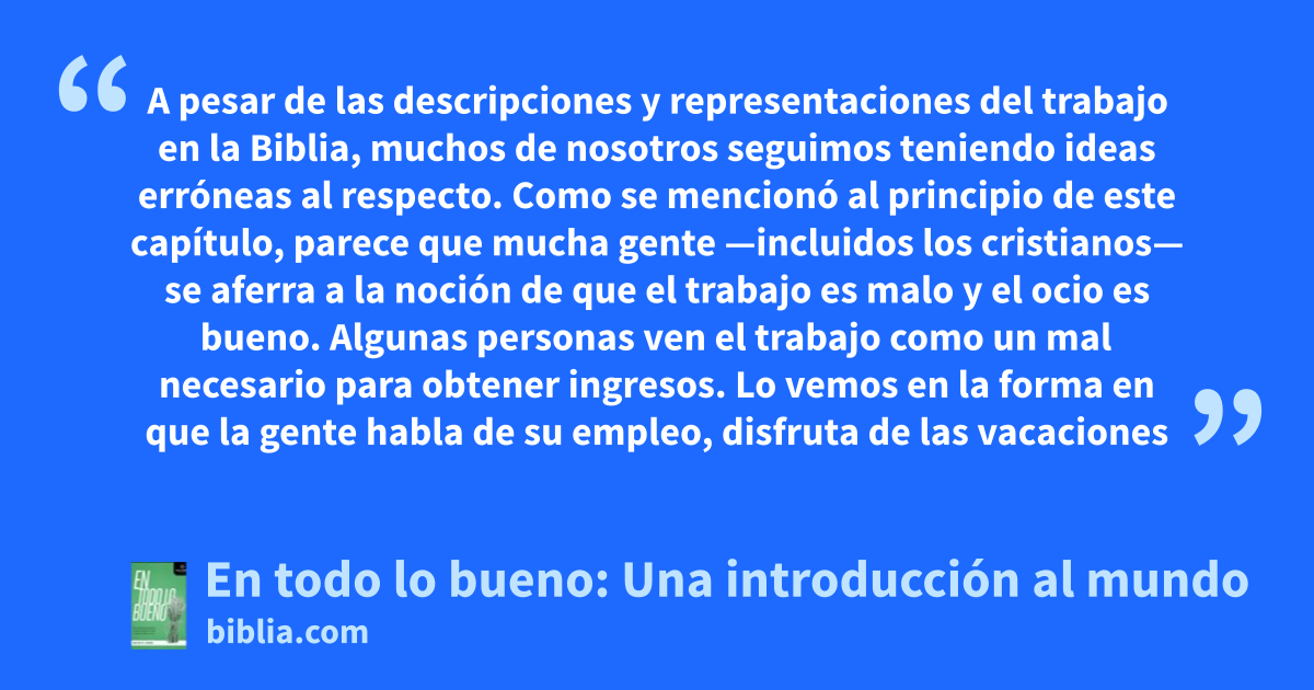 A pesar de las descripciones y representaciones del trabajo en la Biblia, muchos de nosotros seguimos teniendo ideas erróneas al respecto. Como se mencionó al principio de este capítulo, parece que mucha gente —incluidos los cristianos— se aferra a la noción de que el trabajo es malo y el ocio es bueno. Algunas personas ven el trabajo como un mal necesario para obtener ingresos. Lo vemos en la forma en que la gente habla de su empleo, disfruta de las vacaciones