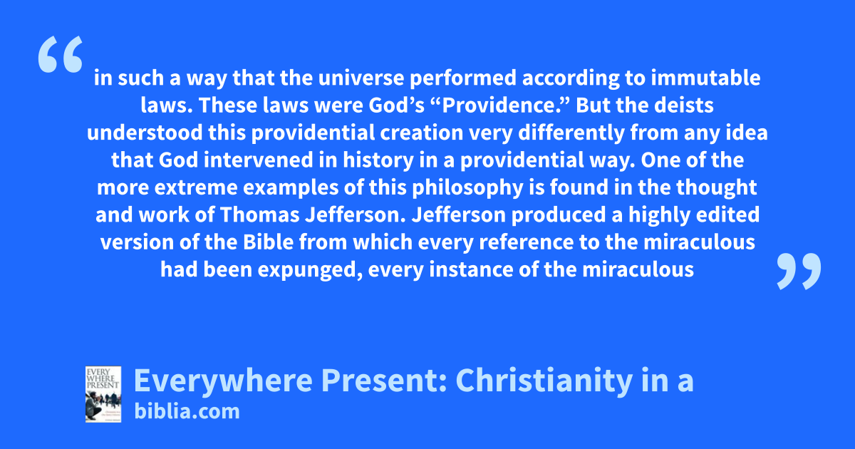 in such a way that the universe performed according to immutable laws. These laws were God’s “Providence.” But the deists understood this providential creation very differently from any idea that God intervened in history in a providential way. One of the more extreme examples of this philosophy is found in the thought and work of Thomas Jefferson. Jefferson produced a highly edited version of the Bible from which every reference to the miraculous had been expunged, every instance of the miraculous