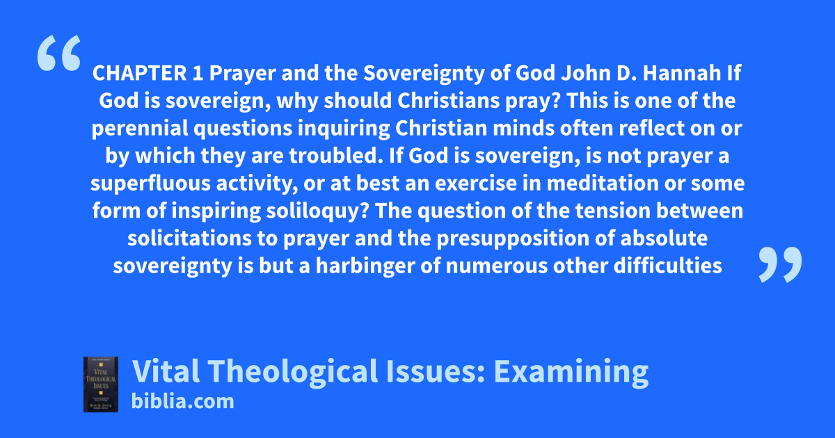 CHAPTER 1 Prayer and the Sovereignty of God John D. Hannah If God is sovereign, why should Christians pray? This is one of the perennial questions inquiring Christian minds often reflect on or by which they are troubled. If God is sovereign, is not prayer a superfluous activity, or at best an exercise in meditation or some form of inspiring soliloquy? The question of the tension between solicitations to prayer and the presupposition of absolute sovereignty is but a harbinger of numerous other difficulties