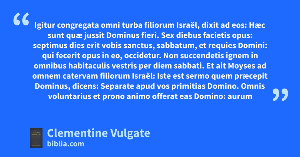 35 1 Igitur congregata omni turba filiorum Israël, dixit ad eos: Hæc sunt quæ jussit Dominus fieri. 2 Sex diebus facietis opus: septimus dies erit vobis sanctus, sabbatum, et requies Domini: qui fecerit opus in eo, occidetur. 3 Non succendetis ignem in omnibus habitaculis vestris per diem sabbati. 4 Et ait Moyses ad omnem catervam filiorum Israël: Iste est sermo quem præcepit Dominus, dicens: 5 Separate apud vos primitias Domino. Omnis voluntarius et prono animo offerat eas Domino: aurum et argentum, et æs, 6 hyacinthum et purpuram, coccumque bis tinctum, et byssum, pilos caprarum, 7 pellesque arietum rubricatas, et janthinas, ligna setim, 8 et oleum ad luminaria concinnanda, et ut conficiatur unguentum, et thymiama suavissimum, 9 lapides onychinos, et gemmas ad ornatum superhumeralis et rationalis. 10 Quisque vestrum sapiens est, veniat, et faciat quod Dominus imperavit: 11 tabernaculum scilicet, et tectum ejus, atque operimentum, annulos, et tabulata cum vectibus, paxillos, et bases: 12 arcam et vectes, propitiatorium, et velum, quod ante illud oppanditur: 13 mensam cum vectibus et vasis, et propositionis panibus: 14 candelabrum ad luminaria sustentanda, vasa illius et lucernas, et oleum ad nutrimenta ignium: 15 altare thymiamatis, et vectes, et oleum unctionis et thymiama ex aromatibus: tentorium ad ostium tabernaculi: 16 altare holocausti, et craticulam ejus æneam cum vectibus et vasis suis: labrum et basim ejus: 17 cortinas atrii cum columnis et basibus, tentorium in foribus vestibuli, 18 paxillos tabernaculi et atrii cum funiculis suis: 19 vestimenta, quorum usus est in ministerio sanctuarii, vestes Aaron pontificis ac filiorum ejus, ut sacerdotio fungantur mihi. 20 Egressaque omnis multitudo filiorum Israël de conspectu Moysi, 21 obtulerunt mente promptissima atque devota primitias Domino, ad faciendum opus tabernaculi testimonii. Quidquid ad cultum et ad vestes sanctas necessarium erat, 22 viri cum mulieribus præbuerunt, armillas et inaures, annulos et dextralia: omne vas aureum in donaria Domini separatum est. 23 Si quis habebat hyacinthum, et purpuram, coccumque bis tinctum, byssum et pilos caprarum, pelles arietum rubricatas, et janthinas, 24 argenti, ærisque metalla, obtulerunt Domino, lignaque setim in varios usus. 25 Sed et mulieres doctæ, quæ neverant, dederunt hyacinthum, purpuram, et vermiculum, ac byssum, 26 et pilos caprarum, sponte propria cuncta tribuentes. 27 Principes vero obtulerunt lapides onychinos, et gemmas ad superhumerale et rationale, 28 aromataque et oleum ad luminaria concinnanda, et ad præparandum unguentum, ac thymiama odoris suavissimi componendum. 29 Omnes viri et mulieres mente devota obtulerunt donaria, ut fierent opera, quæ jusserat Dominus per manum Moysi. Cuncti filii Israël voluntaria Domino dedicaverunt.