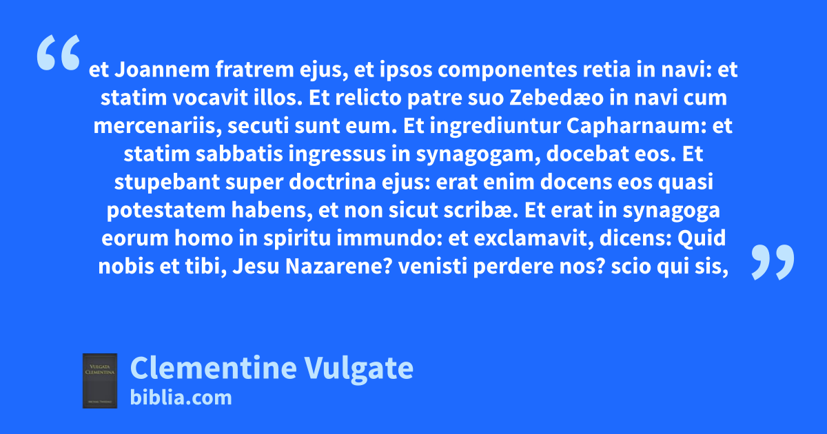 21 Et ingrediuntur Capharnaum: et statim sabbatis ingressus in synagogam, docebat eos. 22 Et stupebant super doctrina ejus: erat enim docens eos quasi potestatem habens, et non sicut scribæ. 23 Et erat in synagoga eorum homo in spiritu immundo: et exclamavit, 24 dicens: Quid nobis et tibi, Jesu Nazarene? venisti perdere nos? scio qui sis, Sanctus Dei. 25 Et comminatus est ei Jesus, dicens: Obmutesce, et exi de homine. 26 Et discerpens eum spiritus immundus, et exclamans voce magna, exiit ab eo. 27 Et mirati sunt omnes, ita ut conquirerent inter se dicentes: Quidnam est hoc? quænam doctrina hæc nova? quia in potestate etiam spiritibus immundis imperat, et obediunt ei. 28 Et processit rumor ejus statim in omnem regionem Galilææ.
