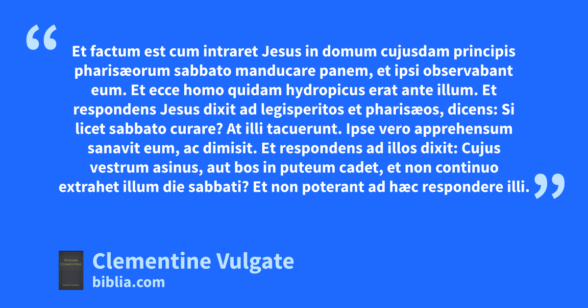 14 1 Et factum est cum intraret Jesus in domum cujusdam principis pharisæorum sabbato manducare panem, et ipsi observabant eum. 2 Et ecce homo quidam hydropicus erat ante illum. 3 Et respondens Jesus dixit ad legisperitos et pharisæos, dicens: Si licet sabbato curare? 4 At illi tacuerunt. Ipse vero apprehensum sanavit eum, ac dimisit. 5 Et respondens ad illos dixit: Cujus vestrum asinus, aut bos in puteum cadet, et non continuo extrahet illum die sabbati? 6 Et non poterant ad hæc respondere illi.