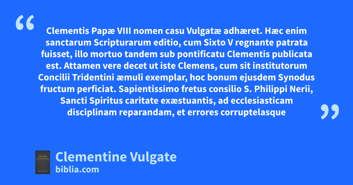 Clementis Papæ viii nomen casu Vulgatæ adhæret. Hæc enim sanctarum Scripturarum editio, cum Sixto v regnante patrata fuisset, illo mortuo tandem sub pontificatu Clementis publicata est. Attamen vere decet ut iste Clemens, cum sit institutorum Concilii Tridentini æmuli exemplar, hoc bonum ejusdem Synodus fructum perficiat.