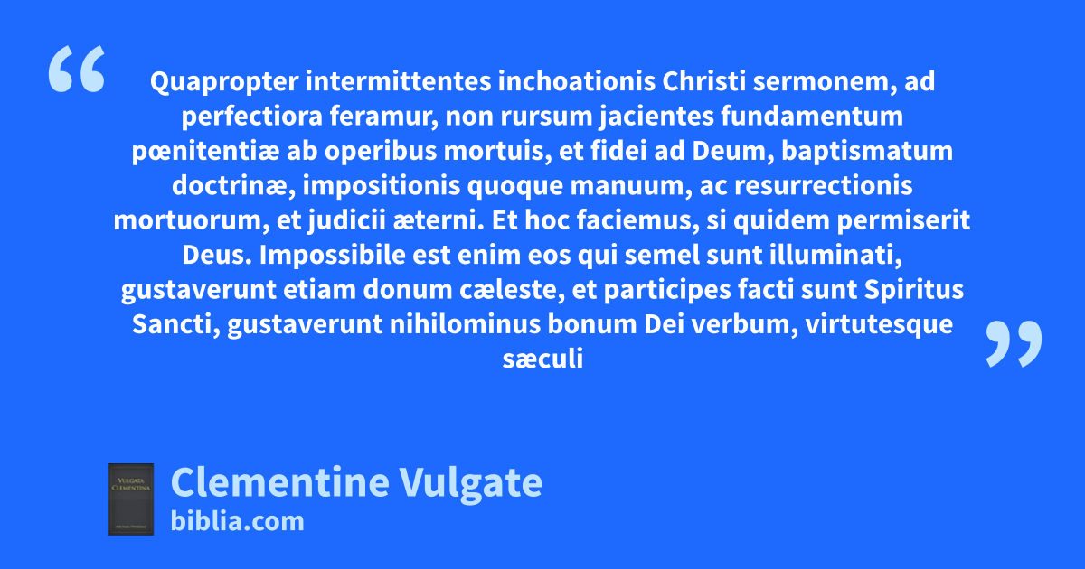 6 1 Quapropter intermittentes inchoationis Christi sermonem, ad perfectiora feramur, non rursum jacientes fundamentum pœnitentiæ ab operibus mortuis, et fidei ad Deum, 2 baptismatum doctrinæ, impositionis quoque manuum, ac resurrectionis mortuorum, et judicii æterni. 3 Et hoc faciemus, si quidem permiserit Deus.