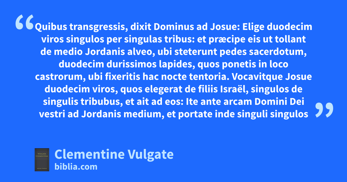4 1 Quibus transgressis, dixit Dominus ad Josue: 2 Elige duodecim viros singulos per singulas tribus: 3 et præcipe eis ut tollant de medio Jordanis alveo, ubi steterunt pedes sacerdotum, duodecim durissimos lapides, quos ponetis in loco castrorum, ubi fixeritis hac nocte tentoria. 4 Vocavitque Josue duodecim viros, quos elegerat de filiis Israël, singulos de singulis tribubus, 5 et ait ad eos: Ite ante arcam Domini Dei vestri ad Jordanis medium, et portate inde singuli singulos lapides in humeris vestris, juxta numerum filiorum Israël, 6 ut sit signum inter vos: et quando interrogaverint vos filii vestri cras, dicentes: Quid sibi volunt isti lapides? 7 respondebitis eis: Defecerunt aquæ Jordanis ante arcam fœderis Domini, cum transiret eum: idcirco positi sunt lapides isti in monimentum filiorum Israël usque in æternum. 8 Fecerunt ergo filii Israël sicut præcepit eis Josue, portantes de medio Jordanis alveo duodecim lapides, ut Dominus ei imperarat, juxta numerum filiorum Israël, usque ad locum in quo castrametati sunt, ibique posuerunt eos. 9 Alios quoque duodecim lapides posuit Josue in medio Jordanis alveo, ubi steterunt sacerdotes qui portabant arcam fœderis: et sunt ibi usque in præsentem diem.