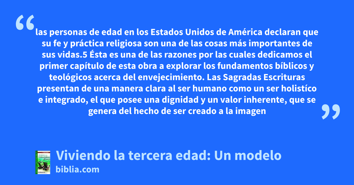 las personas de edad en los Estados Unidos de América declaran que su fe y práctica religiosa son una de las cosas más importantes de sus vidas.5 Ésta es una de las razones por las cuales dedicamos el primer capítulo de esta obra a explorar los fundamentos bíblicos y teológicos acerca del envejecimiento. Las Sagradas Escrituras presentan de una manera clara al ser humano como un ser holistíco e integrado, el que posee una dignidad y un valor inherente, que se genera del hecho de ser creado a la imagen