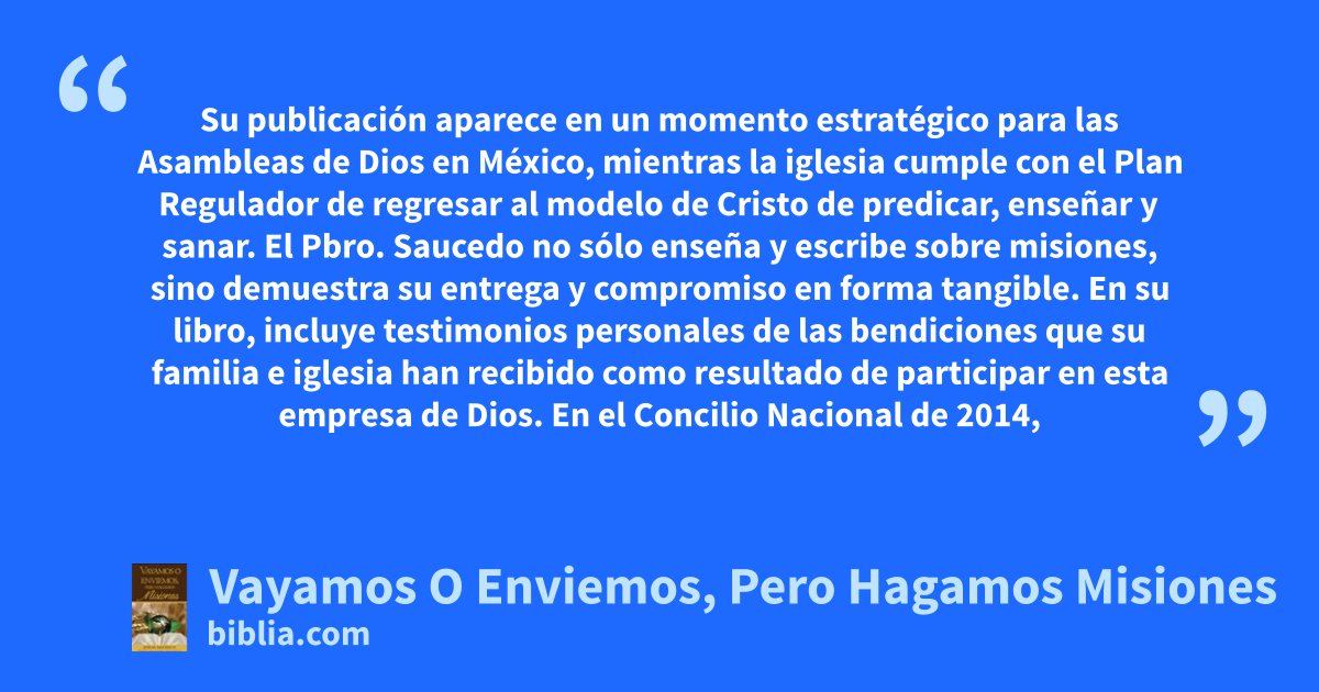 Su publicación aparece en un momento estratégico para las Asambleas de Dios en México, mientras la iglesia cumple con el Plan Regulador de regresar al modelo de Cristo de predicar, enseñar y sanar. El Pbro. Saucedo no sólo enseña y escribe sobre misiones, sino demuestra su entrega y compromiso en forma tangible. En su libro, incluye testimonios personales de las bendiciones que su familia e iglesia han recibido como resultado de participar en esta empresa de Dios. En el Concilio Nacional de 2014,