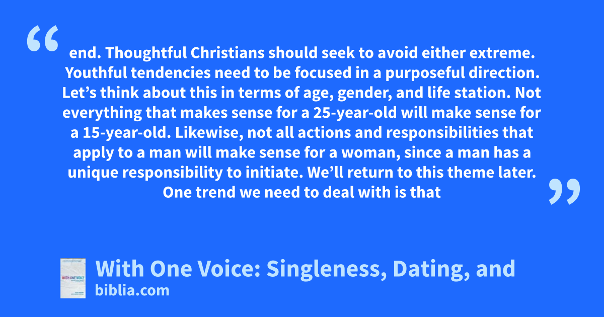 end. Thoughtful Christians should seek to avoid either extreme. Youthful tendencies need to be focused in a purposeful direction. Let’s think about this in terms of age, gender, and life station. Not everything that makes sense for a 25-year-old will make sense for a 15-year-old. Likewise, not all actions and responsibilities that apply to a man will make sense for a woman, since a man has a unique responsibility to initiate. We’ll return to this theme later. One trend we need to deal with is that