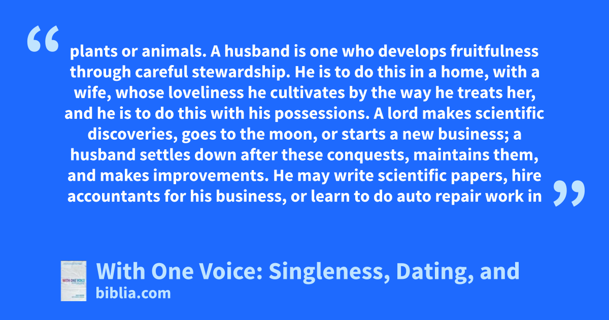 plants or animals. A husband is one who develops fruitfulness through careful stewardship. He is to do this in a home, with a wife, whose loveliness he cultivates by the way he treats her, and he is to do this with his possessions. A lord makes scientific discoveries, goes to the moon, or starts a new business; a husband settles down after these conquests, maintains them, and makes improvements. He may write scientific papers, hire accountants for his business, or learn to do auto repair work in