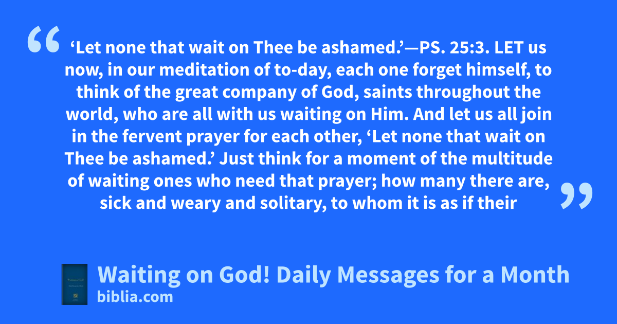 ‘Let none that wait on Thee be ashamed.’—PS. 25:3. LET us now, in our meditation of to-day, each one forget himself, to think of the great company of God, saints throughout the world, who are all with us waiting on Him. And let us all join in the fervent prayer for each other, ‘Let none that wait on Thee be ashamed.’ Just think for a moment of the multitude of waiting ones who need that prayer; how many there are, sick and weary and solitary, to whom it is as if their