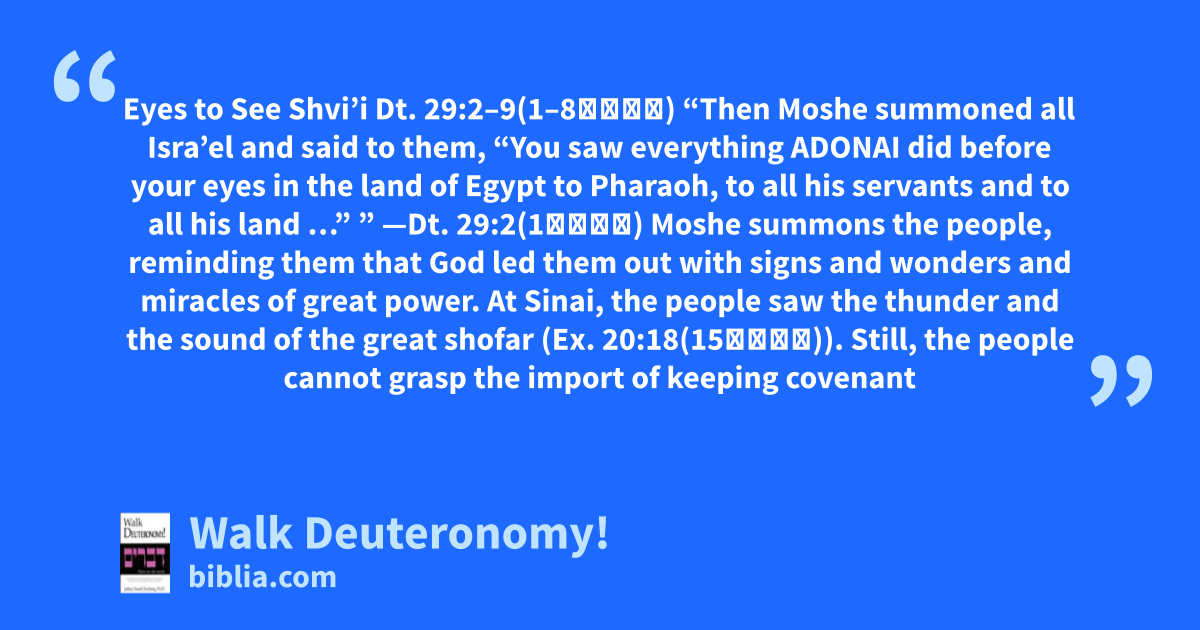 Eyes to See Shvi’i Dt. 29:2–9(1–8תנ״ך) “Then Moshe summoned all Isra’el and said to them, “You saw everything ADONAI did before your eyes in the land of Egypt to Pharaoh, to all his servants and to all his land …” ” —Dt. 29:2(1תנ״ך) Moshe summons the people, reminding them that God led them out with signs and wonders and miracles of great power. At Sinai, the people saw the thunder and the sound of the great shofar (Ex. 20:18(15תנ״ך)). Still, the people cannot grasp the import of keeping covenant