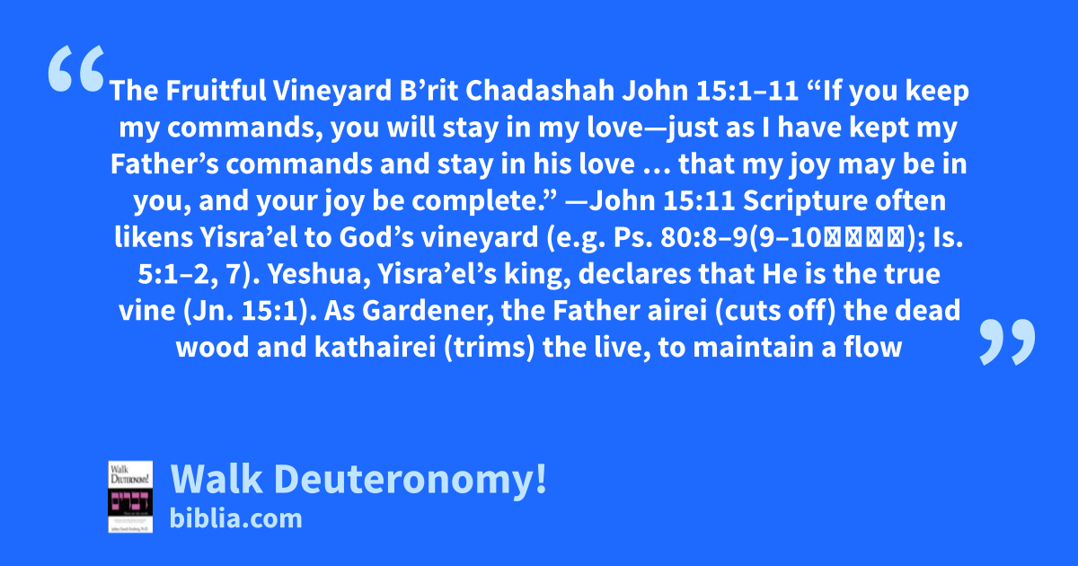 The Fruitful Vineyard B’rit Chadashah John 15:1–11 “If you keep my commands, you will stay in my love—just as I have kept my Father’s commands and stay in his love … that my joy may be in you, and your joy be complete.” —John 15:11 Scripture often likens Yisra’el to God’s vineyard (e.g. Ps. 80:8–9(9–10תנ״ך); Is. 5:1–2, 7). Yeshua, Yisra’el’s king, declares that He is the true vine (Jn. 15:1). As Gardener, the Father airei (cuts off) the dead wood and kathairei (trims) the live, to maintain a flow