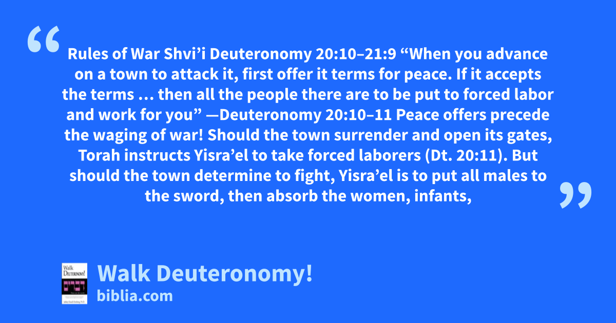 Rules of War Shvi’i Deuteronomy 20:10–21:9 “When you advance on a town to attack it, first offer it terms for peace. If it accepts the terms … then all the people there are to be put to forced labor and work for you” —Deuteronomy 20:10–11 Peace offers precede the waging of war! Should the town surrender and open its gates, Torah instructs Yisra’el to take forced laborers (Dt. 20:11). But should the town determine to fight, Yisra’el is to put all males to the sword, then absorb the women, infants,