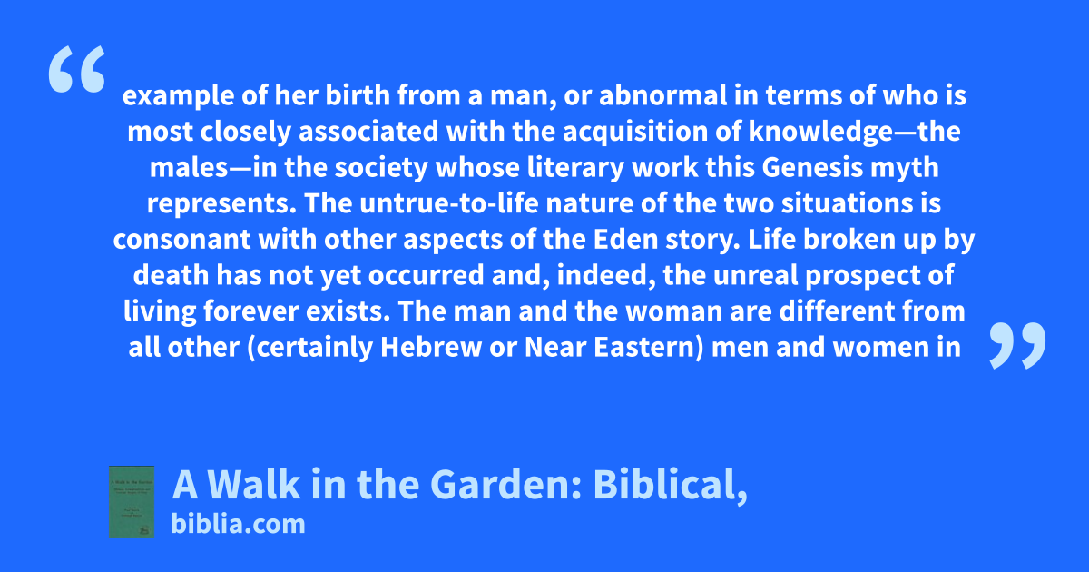 example of her birth from a man, or abnormal in terms of who is most closely associated with the acquisition of knowledge—the males—in the society whose literary work this Genesis myth represents. The untrue-to-life nature of the two situations is consonant with other aspects of the Eden story. Life broken up by death has not yet occurred and, indeed, the unreal prospect of living forever exists. The man and the woman are different from all other (certainly Hebrew or Near Eastern) men and women in