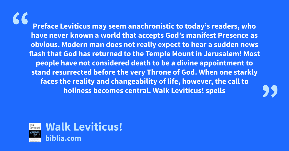 Preface Leviticus may seem anachronistic to today’s readers, who have never known a world that accepts God’s manifest Presence as obvious. Modern man does not really expect to hear a sudden news flash that God has returned to the Temple Mount in Jerusalem! Most people have not considered death to be a divine appointment to stand resurrected before the very Throne of God. When one starkly faces the reality and changeability of life, however, the call to holiness becomes central. Walk Leviticus! spells