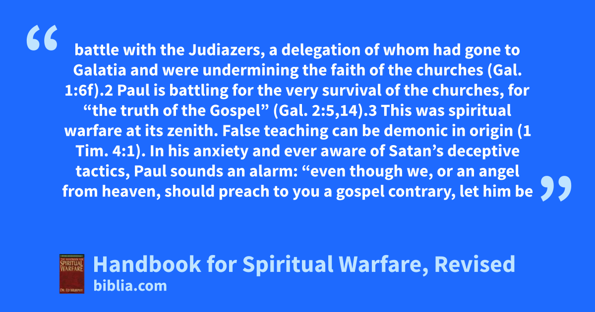battle with the Judiazers, a delegation of whom had gone to Galatia and were undermining the faith of the churches (Gal. 1:6f).2 Paul is battling for the very survival of the churches, for “the truth of the Gospel” (Gal. 2:5,14).3 This was spiritual warfare at its zenith. False teaching can be demonic in origin (1 Tim. 4:1). In his anxiety and ever aware of Satan’s deceptive tactics, Paul sounds an alarm: “even though we, or an angel from heaven, should preach to you a gospel contrary, let him be