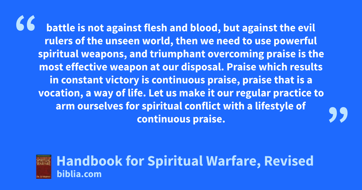 battle is not against flesh and blood, but against the evil rulers of the unseen world, then we need to use powerful spiritual weapons, and triumphant overcoming praise is the most effective weapon at our disposal. Praise which results in constant victory is continuous praise, praise that is a vocation, a way of life. Let us make it our regular practice to arm ourselves for spiritual conflict with a lifestyle of continuous praise.