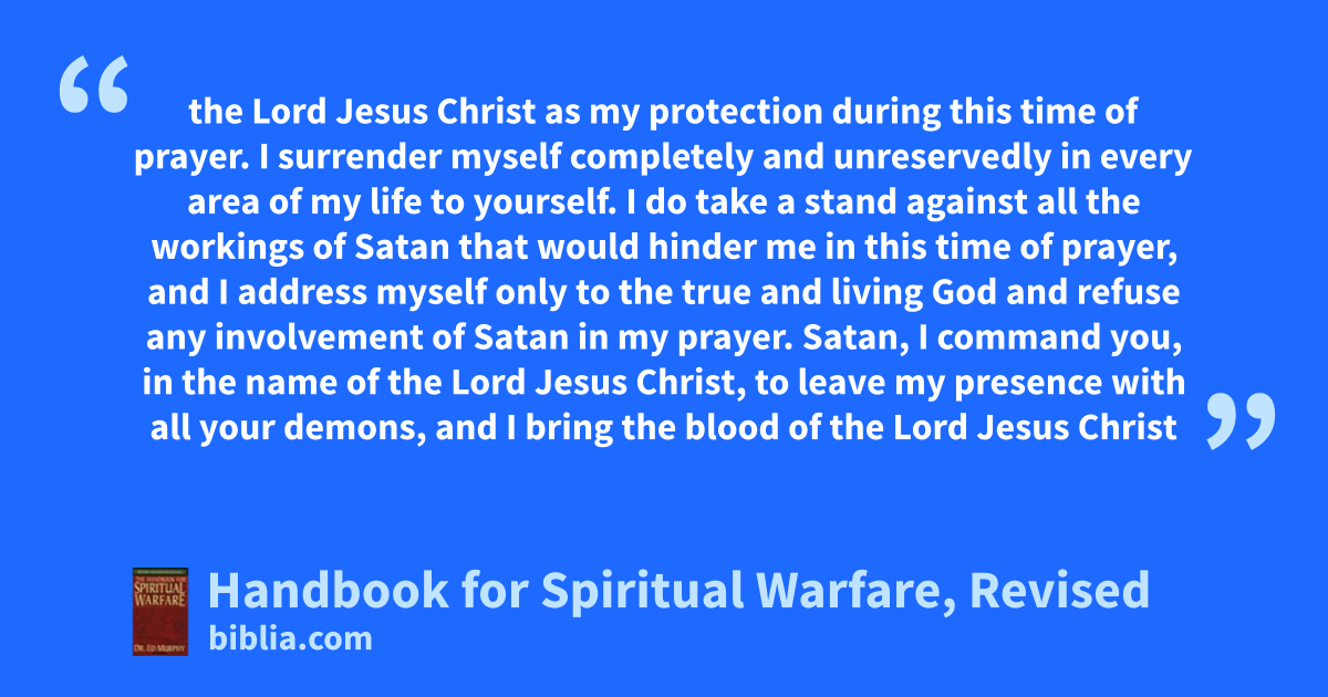 the Lord Jesus Christ as my protection during this time of prayer. I surrender myself completely and unreservedly in every area of my life to yourself. I do take a stand against all the workings of Satan that would hinder me in this time of prayer, and I address myself only to the true and living God and refuse any involvement of Satan in my prayer. Satan, I command you, in the name of the Lord Jesus Christ, to leave my presence with all your demons, and I bring the blood of the Lord Jesus Christ