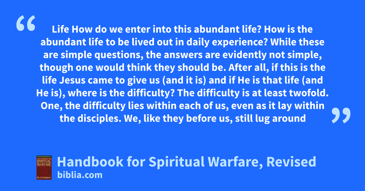 Life How do we enter into this abundant life? How is the abundant life to be lived out in daily experience? While these are simple questions, the answers are evidently not simple, though one would think they should be. After all, if this is the life Jesus came to give us (and it is) and if He is that life (and He is), where is the difficulty? The difficulty is at least twofold. One, the difficulty lies within each of us, even as it lay within the disciples. We, like they before us, still lug around