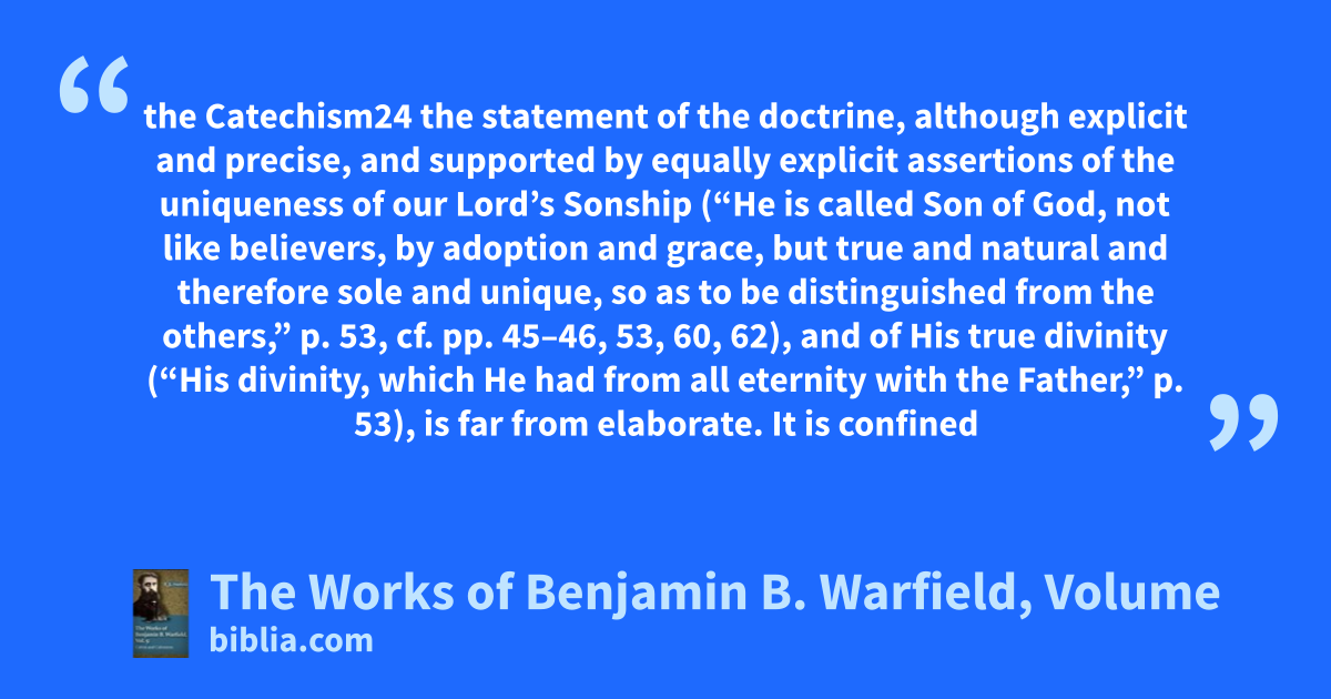 the Catechism24 the statement of the doctrine, although explicit and precise, and supported by equally explicit assertions of the uniqueness of our Lord’s Sonship (“He is called Son of God, not like believers, by adoption and grace, but true and natural and therefore sole and unique, so as to be distinguished from the others,” p. 53, cf. pp. 45–46, 53, 60, 62), and of His true divinity (“His divinity, which He had from all eternity with the Father,” p. 53), is far from elaborate. It is confined