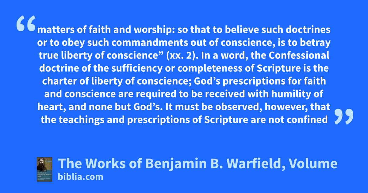 matters of faith and worship: so that to believe such doctrines or to obey such commandments out of conscience, is to betray true liberty of conscience” (xx. 2). In a word, the Confessional doctrine of the sufficiency or completeness of Scripture is the charter of liberty of conscience; God’s prescriptions for faith and conscience are required to be received with humility of heart, and none but God’s. It must be observed, however, that the teachings and prescriptions of Scripture are not confined