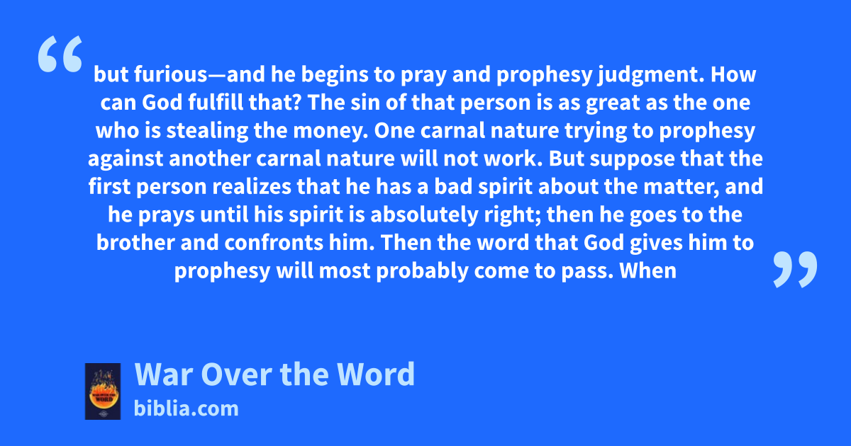 but furious—and he begins to pray and prophesy judgment. How can God fulfill that? The sin of that person is as great as the one who is stealing the money. One carnal nature trying to prophesy against another carnal nature will not work. But suppose that the first person realizes that he has a bad spirit about the matter, and he prays until his spirit is absolutely right; then he goes to the brother and confronts him. Then the word that God gives him to prophesy will most probably come to pass. When