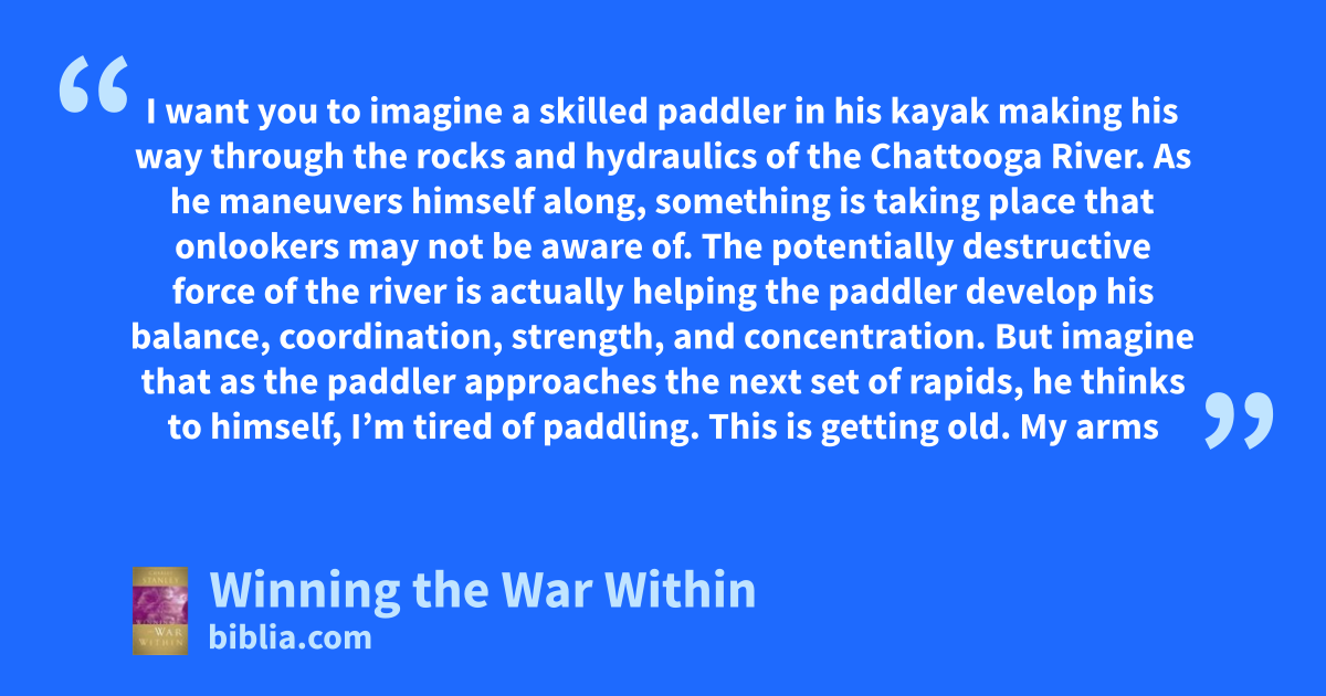 I want you to imagine a skilled paddler in his kayak making his way through the rocks and hydraulics of the Chattooga River. As he maneuvers himself along, something is taking place that onlookers may not be aware of. The potentially destructive force of the river is actually helping the paddler develop his balance, coordination, strength, and concentration. But imagine that as the paddler approaches the next set of rapids, he thinks to himself, I’m tired of paddling. This is getting old. My arms