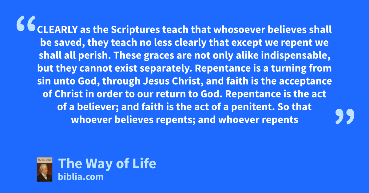 CLEARLY as the Scriptures teach that whosoever believes shall be saved, they teach no less clearly that except we repent we shall all perish. These graces are not only alike indispensable, but they cannot exist separately. Repentance is a turning from sin unto God, through Jesus Christ, and faith is the acceptance of Christ in order to our return to God. Repentance is the act of a believer; and faith is the act of a penitent. So that whoever believes repents; and whoever repents