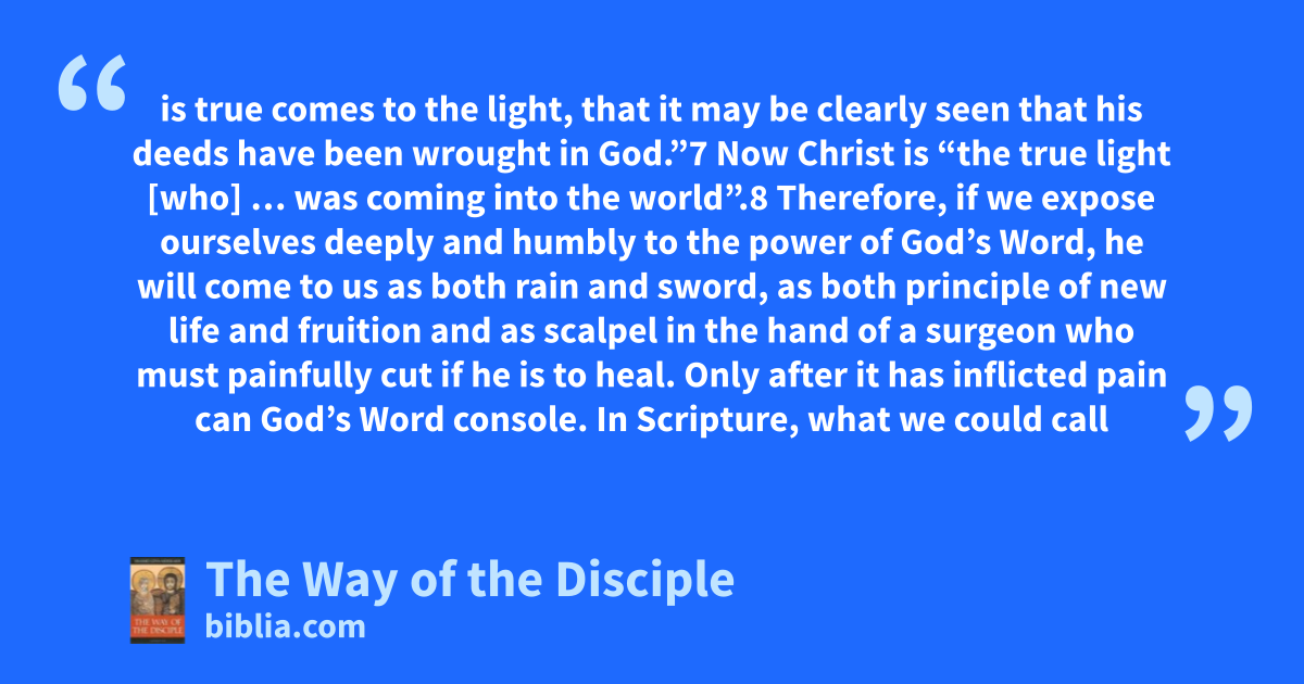 is true comes to the light, that it may be clearly seen that his deeds have been wrought in God.”7 Now Christ is “the true light [who] … was coming into the world”.8 Therefore, if we expose ourselves deeply and humbly to the power of God’s Word, he will come to us as both rain and sword, as both principle of new life and fruition and as scalpel in the hand of a surgeon who must painfully cut if he is to heal. Only after it has inflicted pain can God’s Word console. In Scripture, what we could call