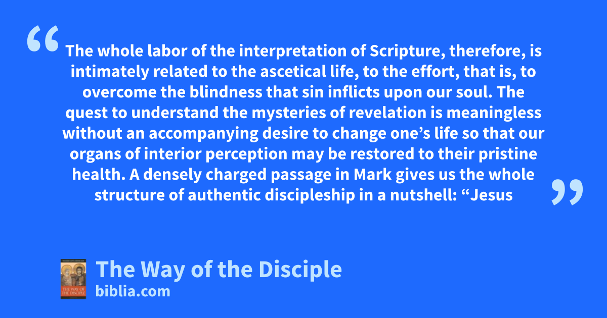 The whole labor of the interpretation of Scripture, therefore, is intimately related to the ascetical life, to the effort, that is, to overcome the blindness that sin inflicts upon our soul. The quest to understand the mysteries of revelation is meaningless without an accompanying desire to change one’s life so that our organs of interior perception may be restored to their pristine health. A densely charged passage in Mark gives us the whole structure of authentic discipleship in a nutshell: “Jesus