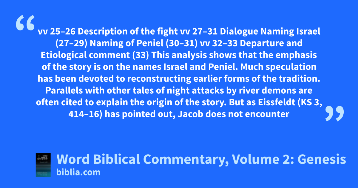 vv 25–26 Description of the fight vv 27–31 Dialogue Naming Israel (27–29) Naming of Peniel (30–31) vv 32–33 Departure and Etiological comment (33) This analysis shows that the emphasis of the story is on the names Israel and Peniel. Much speculation has been devoted to reconstructing earlier forms of the tradition. Parallels with other tales of night attacks by river demons are often cited to explain the origin of the story. But as Eissfeldt (KS 3, 414–16) has pointed out, Jacob does not encounter